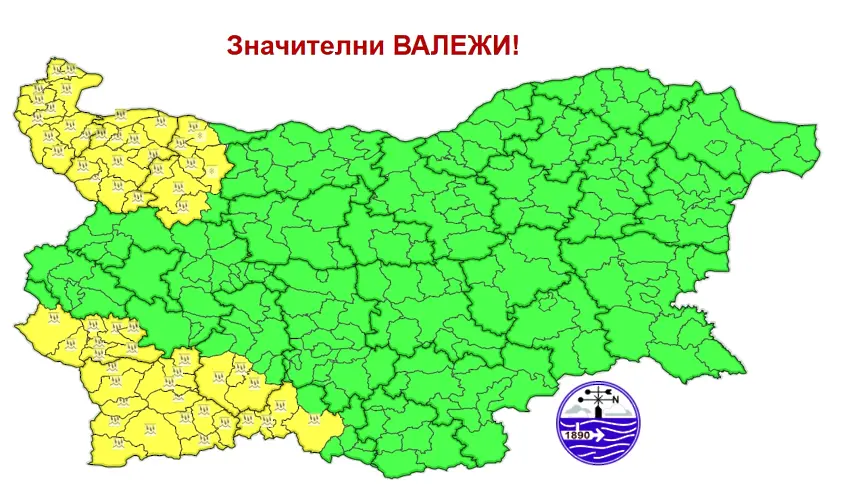 Това са Видин, Враца, Монтана, Кюстендил, Благоевград, Пазарджик и Смолян. На места валежните количества ще са около и над 20 литра на кв.метър., следобед те ще се примесват със сняг.