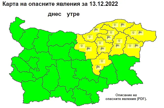 Жълт код за снеговалеж и силен вятър е обявен още за областите Добрич, Шумен, Силистра, Разград, Търговище, Сливен, Велико Търново и Русе.