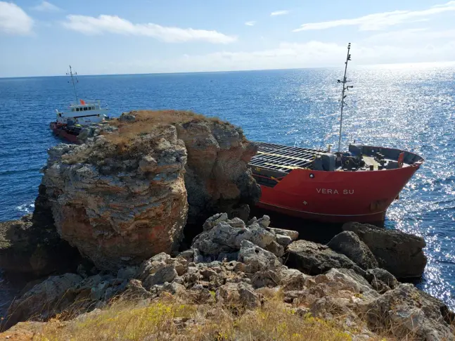 Започна изтеглянето на заседналия край Камен бряг кораб "Вера Су". Два катера от Варненското пристанище се опитват да издърпат кораба на заден ход.