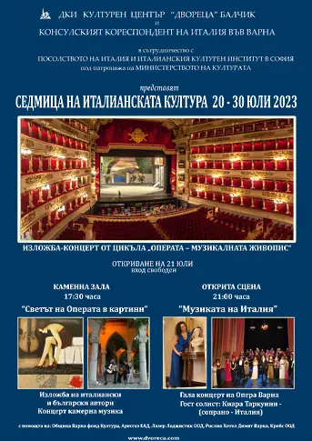 Програмата на Седмицата на италианската култура в Балчик включва откриване на изложбата "Светът на Операта в картини" (на 21 юли, от 17:30 ч., в Каменна зала) и оперен гала концерт на Държавна опера Варна и гост солист Киара Таркуини – сопрано (Италия), на 21 юли, от 21:00 часа, на откритата сцена на Двореца.